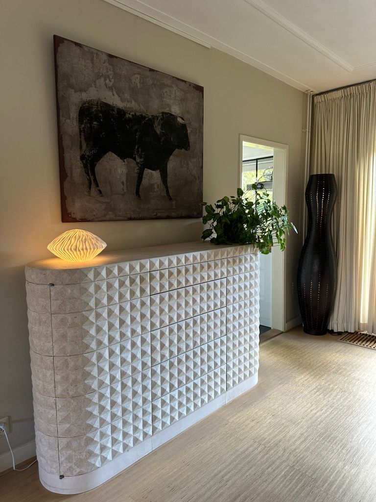 Zo bezocht ik, op een mooie zomermiddag, een huis in Heemstede. Ik kwam binnen en meteen zag ik: over deze inrichting is nagedacht. De kleuren, de formaten, de stijl, de uitvoering: het klopte gewoon. Deze bewoners houden van kunst en design en hebben er oog voor. Een prachtige huiskamer, functioneel én comfortabel ingericht met speciale aandacht voor de werken van de kunstenaars die ze kennen en waarderen. Een gevarieerde collectie ook: klassieke bronzen in de buurt van hedendaags keramiek, een jaren 50 tafel samen met hedendaagse houten design kasten, een 3-D geprinte lamp naast een olieverf met matrozen.