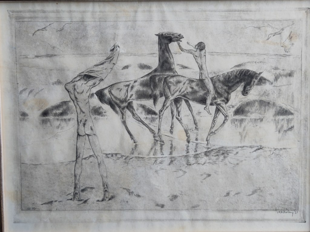 De zwart-wit ets, door mijn moeder steeds ‘de naakte mannen’ genoemd, kreeg mijn moeder van haar vader toen ze 50 jaar werd in 1979. En er zit een heel bijzonder verhaal aan vast. De ets is door mijn oma gekocht op een vendutie, een openbare verkoop, in Fort de Kock op Sumatra, waarschijnlijk in 1935. Mijn moeder was toen een jaar of 4. Mijn grootouders zijn in 1931 geëmigreerd naar het toenmalige Nederlands-Indië en mijn moeder was toen bijna 2 jaar. De vendutie werd gehouden door een van de buren, Annie van den Burg-Röling een favoriete tante van mijn moeder. Annie keerde terug naar Nederland en kon niet alles meenemen.