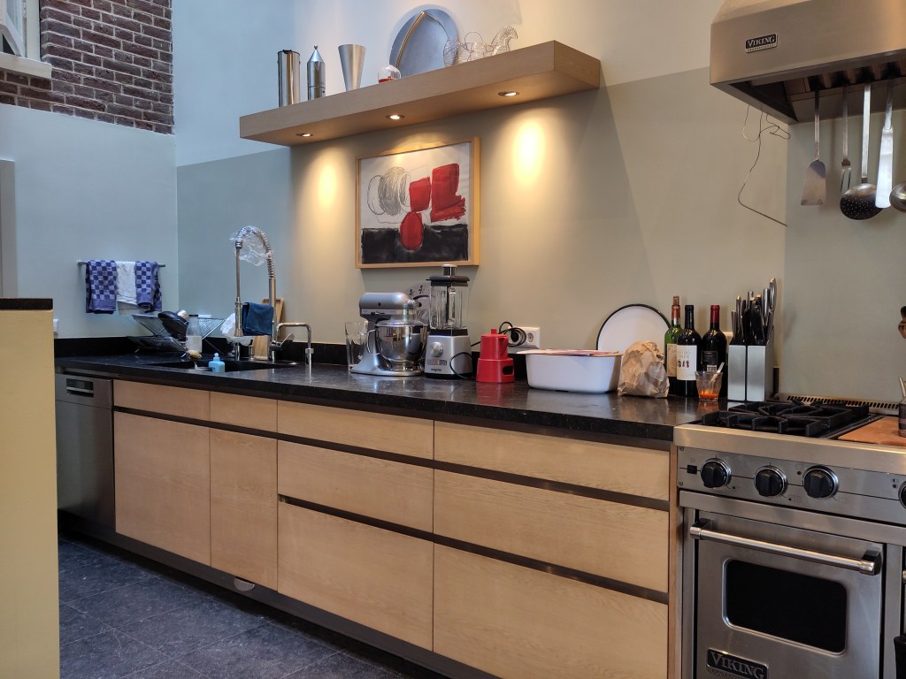 We lopen naar boven waar een groot werk van een bevriende kunstenaar hangt. Ik denk meteen: dat kan best mooi staan beneden. Gelukkig mag het schilderij van de muur en we brengen het naar beneden. Daar kijken we hoe het aan de muur staat. We verplaatsen gezamenlijk nog wat werken en ik geeft tips om wat rust in de eetkamer te krijgen mét de bestaande kunstwerken. Al met al geeft het gesprek stof tot nadenken en dit advies is dan ook nog niet klaar. Over een maand praten we verder.