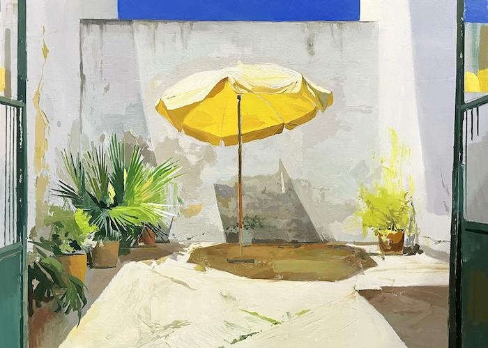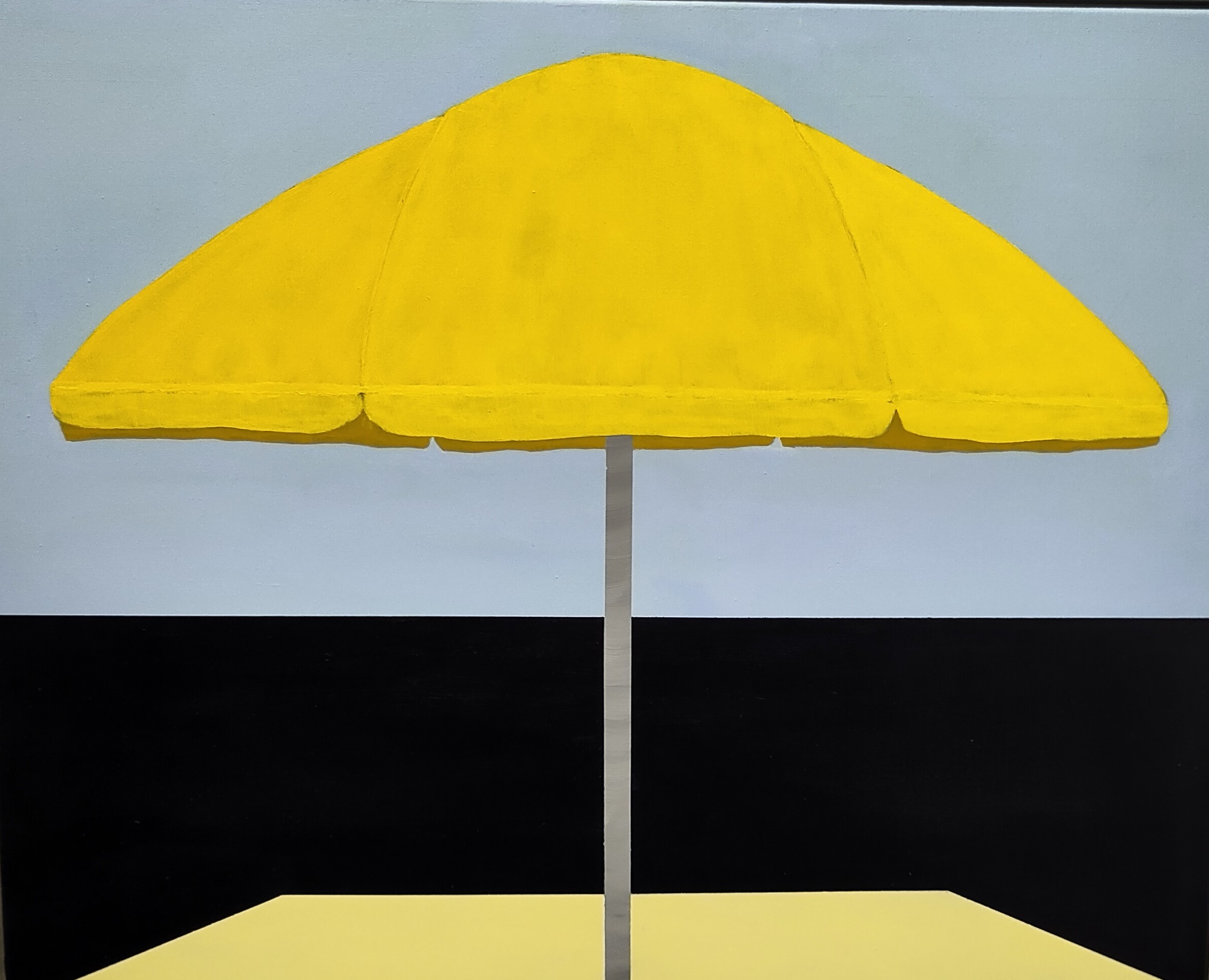 En ik zag parasols. De parasol, en overigens ook zwembaden en palmbomen, als symbool voor een zomerse vrolijkheid en warmte. Parasols van Frank van Roessel, Isabelle Derecque, Lucinda Metcalfe, Monique Rodriguez en Antonio Barahoona. Onder een parasol kan je tot rust komen van de hectiek van het dagelijks leven. lui zittend of liggend onder een parasol hoeft je even aan niets te denken. Goed boek erbij en je hebt vakantie. Dat is de sfeer die je in huis wil halen. Dat is wat we nu even nodig hebben.